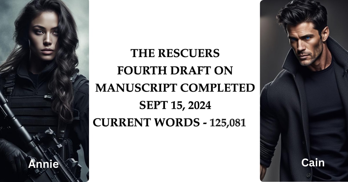 Fourth draft edit down on Book Two, The Rescuers in hopes of a January 2025 publish date.